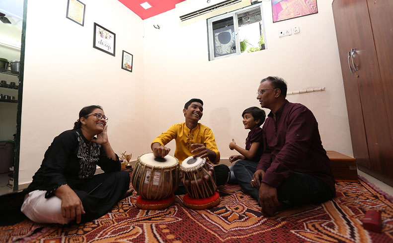 学校で音楽を学んでいるシヨンさんは、北インドの古典音楽で使われる2つの太鼓を組み合わせた打楽器「タブラ」を演奏するのが大好き。練習も全く苦にならず、いろいろな曲の演奏をしています。休日は、両親と一緒に養護施設に出向き、子どもたちのためにタブラを演奏することもあります。