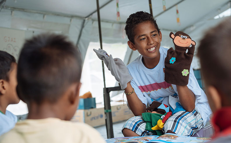 「2016年に大きな地震が起きて、家が壊れてしまいました」と話すリベールさん。そんななか、ユニセフが地震発生直後に立ち上げた「Return to Happiness(もう一度幸せになろう)」プロジェクトにユース・ボランティアとして参加。近所の子どもたちを集めて一緒に遊んだり、本の読み聞かせをしたり、衛生的な状態を保つために必要なことを伝えたりしました。