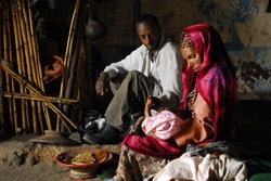 | 赤ちゃんに母乳をあげる母親と見守る父親。(エチオピア)。 |