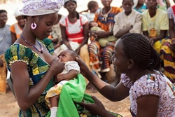 | 保健員から母乳育児の方法を教わる母親。(ブルキナファソ)。 |