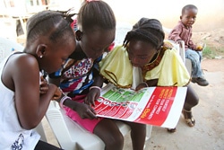 | ユニセフは感染拡大を阻止するため、啓発活動に力を入れている。予防法のポスターを読む子どもたち。 |