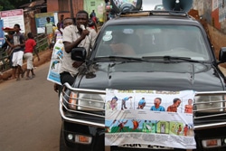 | 車にエボラに関する公用情報ポスターを貼って町を巡り、予防法を広めるスタッフ。 |