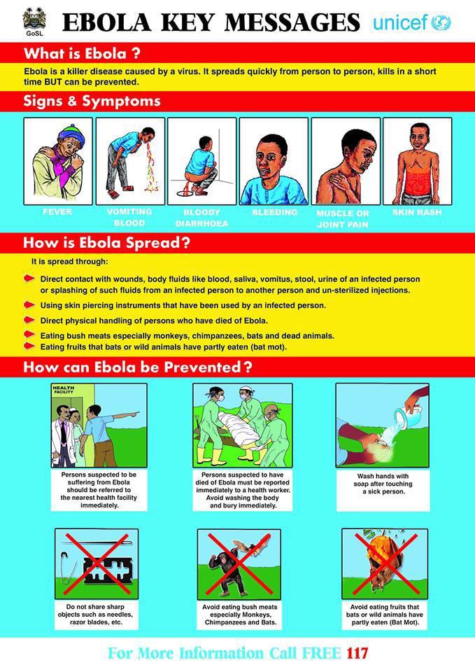- 通話料無料のシエラレオネ国家緊急コールセンター(電話番号:117)を拡大し、無休(24時間/毎日稼動)とした上で、一般の人や医療関係者からの相談を受け付け、またユニセフが支援する「Rumor Bank(うわさ銀行)」に寄せられたうわさを分析してコールセンターと連動させ、正しい情報や対応などをメディアなどを通じて発信していく