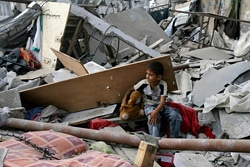 | 瓦礫の中で、おもちゃを片手に座る男の子。 |