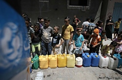 | ユニセフはガザの子どもたちや家族に安全な飲み水を提供。水の供給所で水を汲むために列に並ぶ子どもたち。 |