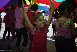 | 無期限の停戦で、子どもたちが外で遊べるように。ユニセフとパートナー団体が避難所で行う心のケアのためのレクレーション活動に参加する子ども。 |