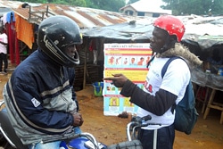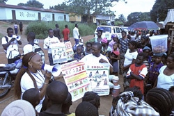 | ポスターを見せながらカイラフンの町でエボラの症状や予防法を伝える様子。 |