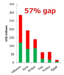 | グラフ:シリア緊急支援に必要な資金要請に比べた不足額 57%が不足している(緑:充足分、赤:不足分) |