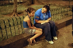 | 真夜中にも関わらず路上にいた11歳の女の子と話をする社会福祉省のスタッフ。(コロンビア) |
