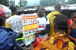 | カイラフンで住民にエボラの症状や予防法を伝えるスタッフ。 |