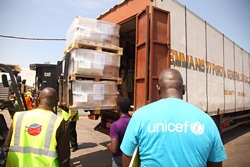 | 9月5日、防護服や医薬品などの医療物資がシエラレオネに到着。 |