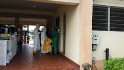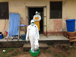 | ラゴスにあるエボラの隔離治療センター。病棟に入る前に、防護服を着用する医療関係者。 |