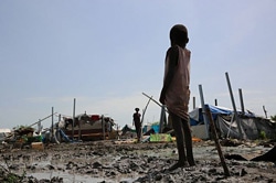 避難民の方々は安全を求めてキャンプでの生活を営んでいますが、国連基地は元々それほど大規模な数の人々を受け入れる施設ではないため、現在の生活環境は非常に厳しいものがあります。人々は簡易テントでの生活を強いられているため、私たちは日々生活環境の向上に勤めていますが、現在も続く長い南スーダンの雨期は住居環境を水浸しにし、文字通り人々は泥水の中で暮らし、先の見えない環境に疲弊している状況です。