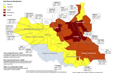 激しい戦闘が起きている上ナイル州、ユニティー州、ジョングレイ州の一部では、IPCのレベルで5段階のうち、2番目に深刻な状況を示すレベル4(緊急レベル)、上記3州の一部ならびに東エクアトリア州ではレベル3(危機レベル)となっている。