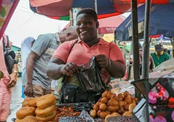 | ラゴスの市場で揚げたパンを売る女性。エボラの正しい知識があるので、エボラから回復した人もお店に歓迎すると語る。 |