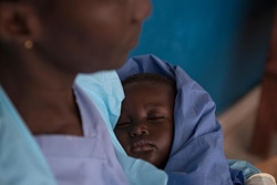 | エボラの感染が疑われる人たちが身を寄せるセンターで、抱かれて眠る1歳の赤ちゃん。エボラの症状は出ていないものの、両親をエボラで失い、面倒をみることができる親せきを探している。 |