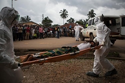 | エボラに感染した恐れのある人を車に乗せるスタッフ。周りには、感染を恐れて遠くから見守る人々も。 |