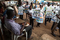 | 町でエボラの啓発活動を行うスタッフ。(シエラレオネ) |