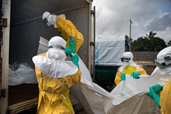 | 防護服を着てエボラ患者の遺体を運ぶスタッフ。(リベリア) |