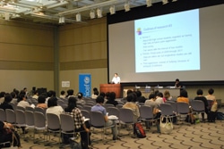 そして、ネット上で子どもを守るためには、子どものエンパワーメントが重要であることや、子どもを暴力や虐待から守るための(ネット以外の問題も含めた)より広い取り組みの中に位置づける必要があることを訴えました。さらに、ユニセフとITU(国際電気通信連合)が国際会議の直前の9月5日に発表した『インターネット上の子どもの保護に関する企業のためのガイドライン』を紹介しながら、ICTに関わる幅広い人々の協力が不可欠であり、なかでも企業が果たすことのできる役割を強調しました。