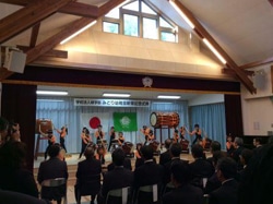 これまで園の再建に関わったたくさんの方々や保護者、先生方が集まって開かれた竣工式。式典の最後には、亡くなられた前園長の時代から園が力を入れられている和太鼓の演奏が、年長組の子どもたちの手で力強く披露されました。