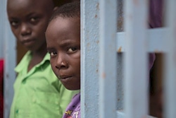 | 身を寄せるエボラから回復した子どもたち。ケネマのエボラ治療センターにて。(シエラレオネ) |