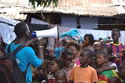 | 町を訪れ、エボラの予防法を子どもたちに説明するスタッフ。(ギニア) |