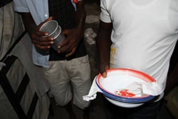 | 食堂のないMpimba刑務所で、ユニセフが提供した調理器具や食器を手にする子ども。 |