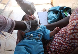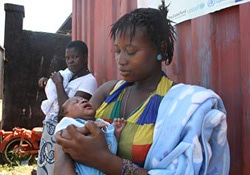| フリータウンの政府中央医療倉庫の隣にある予防接種所でBCGとポリオの予防接種を受ける赤ちゃん。 |