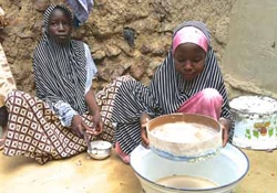 「でもこれからは、ふたりとも学校に通うことができます」と、庭に座りながら玉ねぎを切ったり粟をふるいにかける娘たちを誇らしげに指さし、アティカさんが話します。