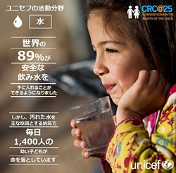 ユニセフの活動の中で、最も成果をあげてきた活動のひとつが予防接種。予防接種は命を落としている子どもたちの数を確実に減らせる可能性を持ち、2000年から2012年の間で1,380万人もの子どもの命が守られました。2013年、予防接種を受けた子どもの数は1億1,100万人以上、世界の子どもたちのおよそ84%にまで達しました。また、ユニセフの母子保健の推進により、1990年以降、生後28日以内に死亡する新生児数が3分の1以上減少しました。そして、水と衛生の分野の支援では、1990年以降、23億人が新たに安全な飲み水を使えるようになり、安全な飲み水を手に入れる人は世界の89%にのぼっています。その他にも、教育や子どもの保護などのあらゆる分野で、成果が表れています。詳しくは、子どもの権利条約25周年:ユニセフの活動集(インフォグラフィックス)をご覧ください。