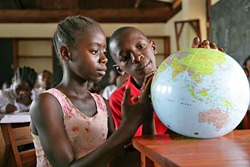 | 地球儀を見ながら勉強をする子どもたち。(リベリア) |