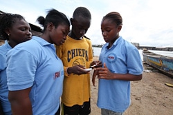 | エボラの社会啓発活動に活用されている、U-Reportの使い方を教える若者たち。(リベリア) |