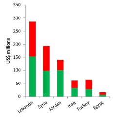 | グラフ:シリア緊急支援に必要な資金要請に比べた、各国の不足額 42%が不足している(緑:充足分、赤:不足分) |