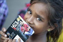 | HIVの啓発用パンフレットを手にする路上で生活する少女。(スリランカ) |