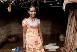 | 自宅にできたトイレの前で笑顔を見せる少女。(インド) |