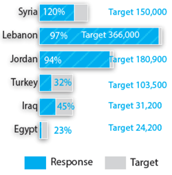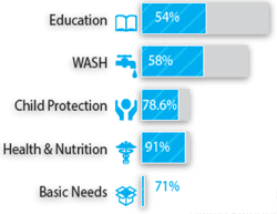 ユニセフは2014年にシリアと周辺国への支援に必要な資金の36%が依然として不足している。なかでも、トルコが最も資金不足に直面しており、要請額の50%が不足。シリアは40%以上が不足している。最も資金が不足している分野は教育で、約50%が不足。