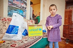 | ドネツクから避難し、ハルキウに身を寄せている4歳の女の子。ユニセフが配布した衛生キットを受け取った。 |