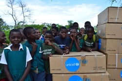 | 被災地に届けられたユニセフの支援物資。「わたしたちが置かれている状況を、この地域の人以外だれも知らないと思っていました。だから、支援が来て、『わたしたちのことを想ってくれる人がいるのだ』と、希望を持てました。とても嬉しかったです」と、女の子が話した。 |