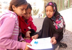 | ユニセフが配布した、心のケアと地雷の危険性に関するチラシを友達に見せるリハムちゃん(13歳)。 |