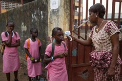 | ギニアのコナクリにある小学校で学校が再開。登校する生徒たちに非接触式体温計を使って体温検査を行う様子。 |