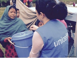 | 被災した家族に水と衛生の支援物資を届けるユニセフスタッフ |