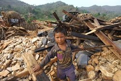 | かつて自宅のあった場所を歩く男の子。(5月7日撮影) |