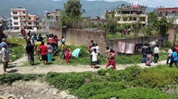| マグニチュード7.3の大規模な余震後、カトマンズの人々が屋外や道に集まる様子。 |