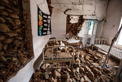 | ヌワコットにあるユニセフが支援する病院。地震の被害を受け、産科病棟が瓦礫で覆われた。 |