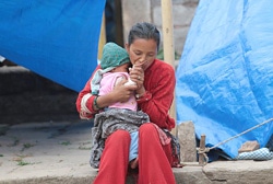 カトマンズから北東に180キロ程離れた場所に位置しているドラカ郡は、12日の大規模地震の震央地域です。そのドラカ郡のビメシワールで、一時避難所に身を寄せている母親のシャンティさんが、生後6カ月の娘の手にそっと頬を寄せています。多くの家族が家を失い、幼い子どもがいても、安全に過ごす場所さえないのです。ユニセフは、ドラカ郡やシンドゥパルチョーク郡など、12日の地震による被害が最も大きかった地域での支援活動を強化しています。