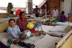 | 障がいのある子どもたちのためリハビリセンター附属病院で、ボールで遊ぶジャヤちゃん(11歳) |
