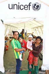 | ドラカ郡ビメシワールでユニセフが支援する治療テントを訪れた家族。子どもたちは全壊した家屋の下敷きとなり傷を負った。 |