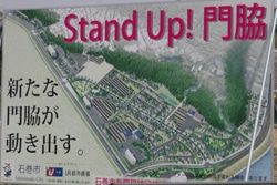 | 「Stand Up!門脇」と題された、新しいまちづくりへの取り組みを伝えるポスター |