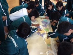 ワークショップに参加したのは、81人の門脇中学校1年生。彼らの中には、震災時に全焼し、震災遺構としての保存の是非が検討されている新門脇地区の旧門脇小学校(本年3月に廃校)の最後の卒業生もいます。この日から、7月の「発表会」までの全6回のワークショップを通じ、生まれ育った土地の歴史や「まちづくり」の基本的な考え方や手法、そして自分の意見や考え方を発表することの大切さを学びながら、「まち」に住む様々な人々が親しめる「みんなの公園」の姿を、模型で形にしてゆきます。そして、石巻市等事業関係者のご協力をいただきながら、子どもたちの思いやアイディアを具体の公園計画に反映していくことを目指しています。